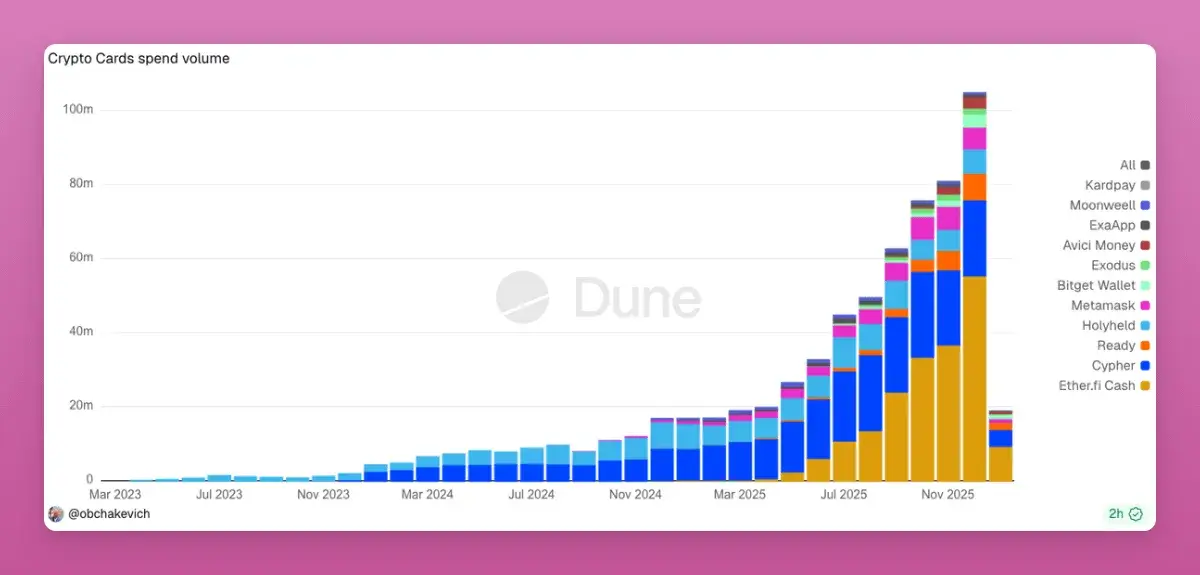 目前,加密支付卡因其规避银行严格 AML 要求的便利性而爆发。每刷一次卡都是链上的一笔交易。如果 2026 年能出现绕过 Visa/Mastercard 的直接 点对点 支付,那将是万倍的机会。
