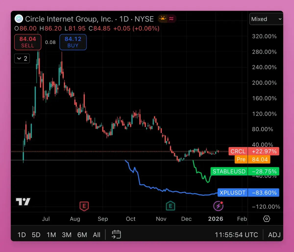 2025 年,叙事已从“交易”转向“支付基础设施”。然而,交易稳定币叙事并不容易:Circle 的 IPO 在经历暴涨后回吐了所有涨幅,其他代理资产表现也不尽如人意。