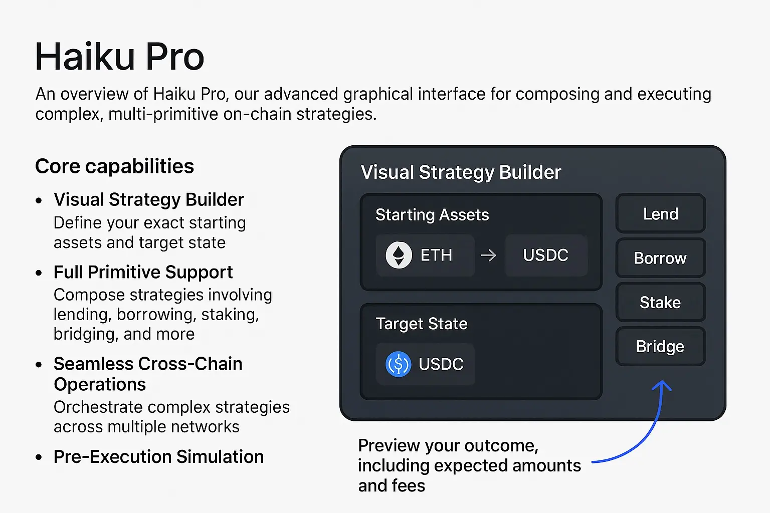 Haiku Pro 是一个面向专业交易者、资产管理人与 DeFi 高阶用户的 高级图形化策略界面 ,能够在无需编写任何代码的情况下,通过可视化方式构建并执行复杂的多步骤链上策略。