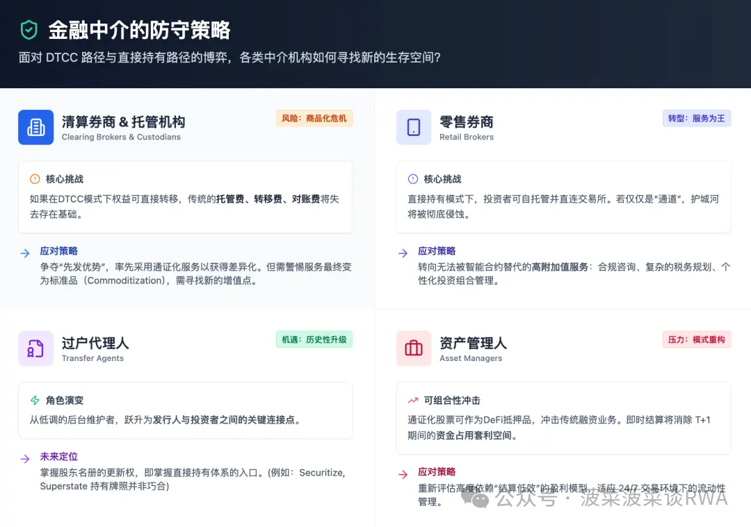 在DTCC模式下,它们的角色得到巩固——普通投资者依然只能通过券商触达市场。但直接持有模式的扩散会侵蚀这一护城河。如果投资者可以自己托管SEC注册股票,并在合规的链上交易所交易,零售券商的存在价值是什么?答案可能在于服务:合规咨询、税务规划、组合管理——那些无法被智能合约替代的高附加值功能。