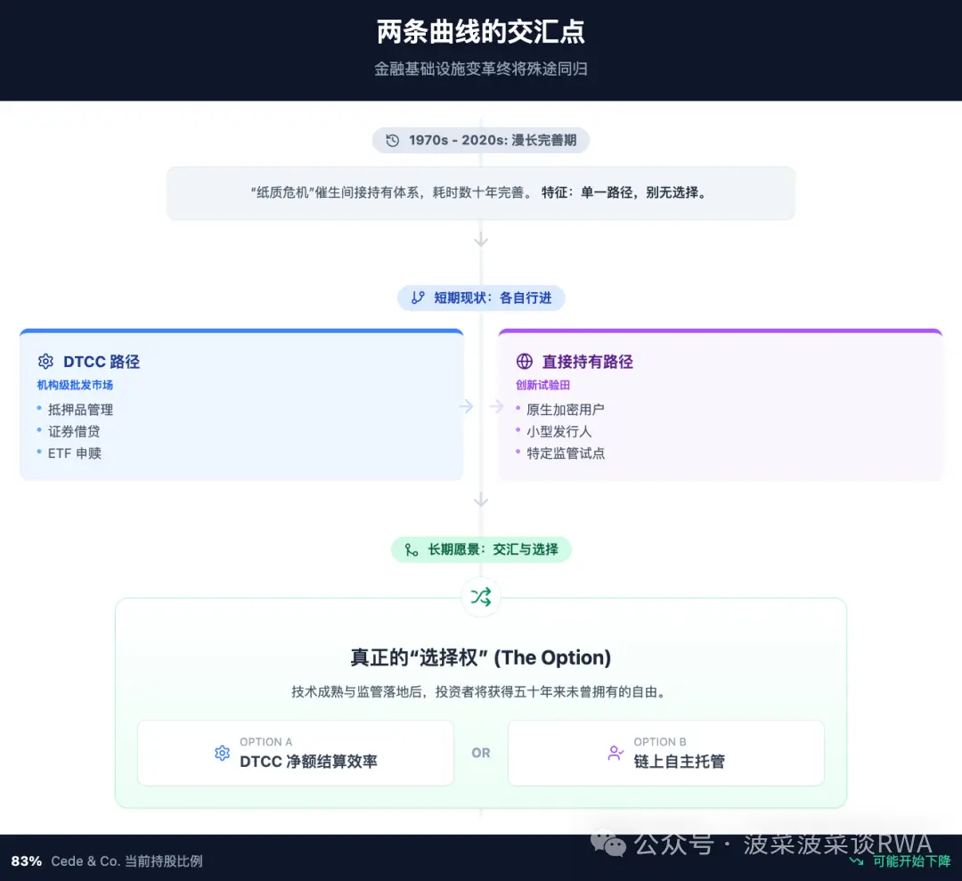 长期来看,两条曲线可能走向交汇。当通证化权益的流通规模足够大,当直接持有的监管框架足够成熟,投资者可能第一次获得真正的选择权——在DTCC系统内享受净额结算的效率,或退出到链上自托管,拿回对资产的直接控制。