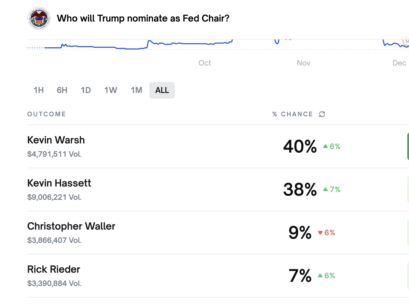 截止发文, Polymarket 数据显示 ,Kevin Warsh 当选美联储主席的概率暂报 40%(上涨 6%),Kevin Hassett 当选美联储主席的概率暂报 38%(上涨 7%),Christopher Waller 当选美联储主席的概率暂报 9%(下跌 9%),Rick Rieder 当选美联储主席的概率最低、暂报 7%(上涨 6%)。虽然与 Warsh 和 Hassett 的胜率相比较低,但至少上涨了 6 个点,马上就可以把 Waller 斩于马下。