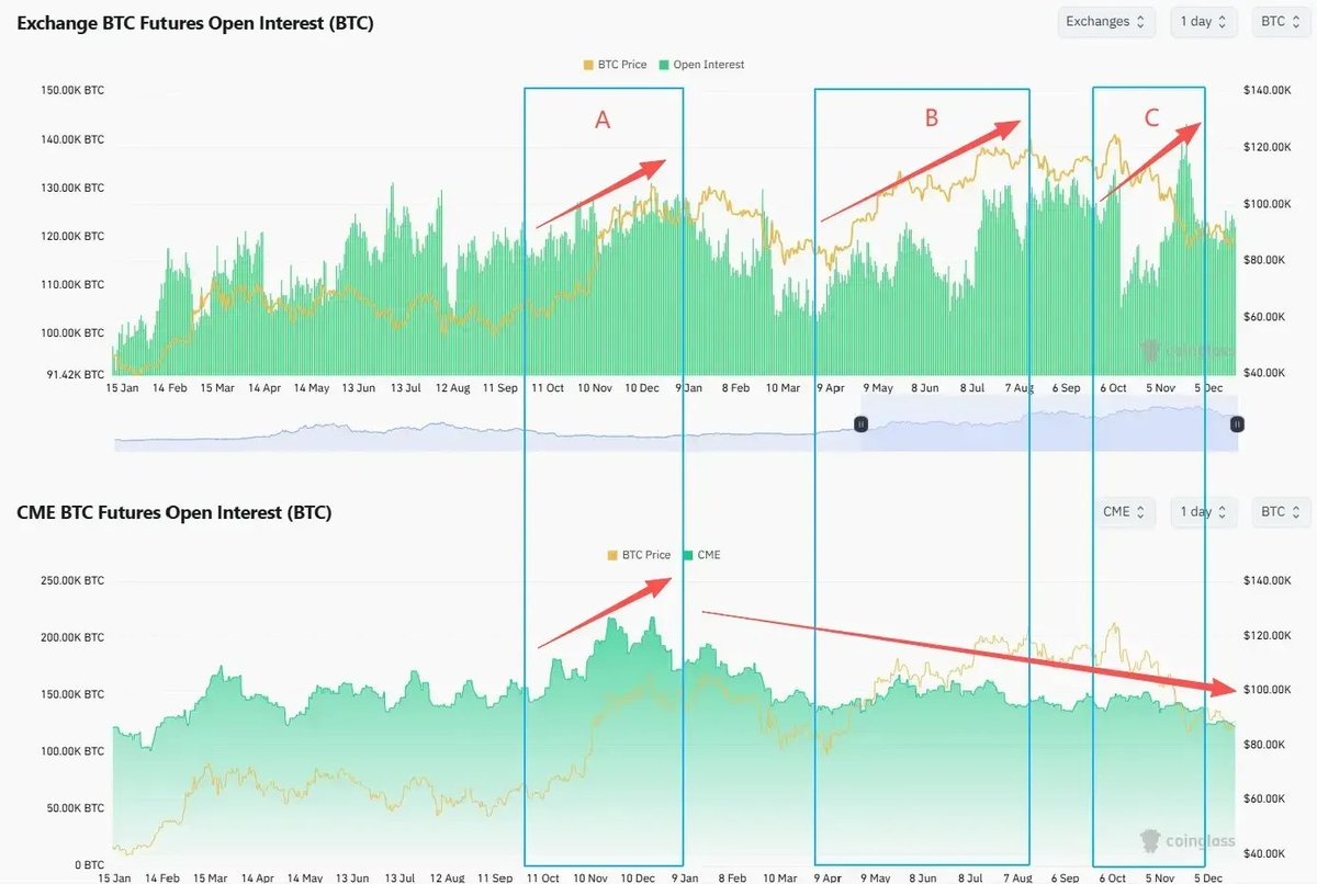 自2025年初以来,在岸未平仓合约(CME)呈下降趋势。机构投资者并未因合约创出新高而重新增加风险敞口。