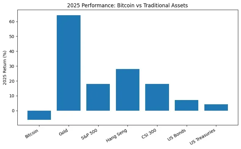 2025年真正的“财富效应”并非体现在加密货币领域:标普500指数(+18%)、纳斯达克指数(+22%)、日经指数(+27%)、恒生指数(+30%)、韩国综合股价指数(+75%),甚至A股也上涨了19%,均实现了强劲增长。黄金(+70%)和白银(+144%)也大幅上涨,相比之下,“数字黄金”显得有些滑稽可笑。
