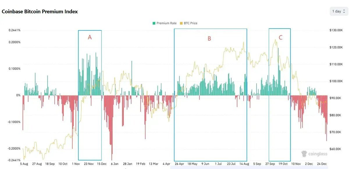 Coinbase Premium 在 A、B 和 C 阶段均保持正值。高水平的买盘需求主要来自境内现货资金。