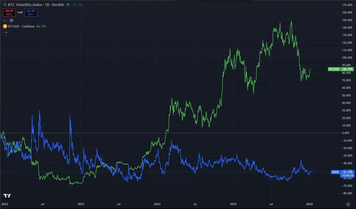 2025年8月,比特币价格首次突破12万美元时,DVOL接近局部低点。期权市场并未对持续风险给予足够的补偿。