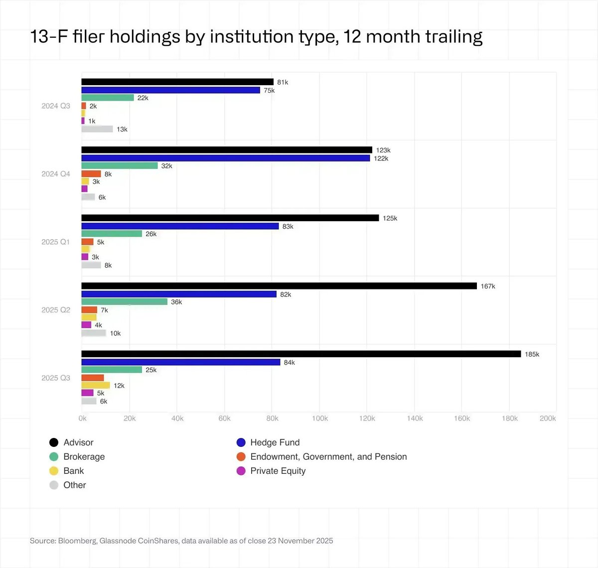 另一个常被误解的领域是 ETF。到 2025 年底,美国现货比特币 ETF 持有约 136 万枚,同比增长约 23%,约占流通供应量的 6.8%。