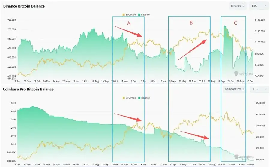 Coinbase BTC Balance 周期内持续下行,CEX 侧的可售筹码减少。与之对照,Binance Balance 在 B、C 两个阶段随价格反弹而显著上升,对应 offshore 现货的潜在抛压增加。