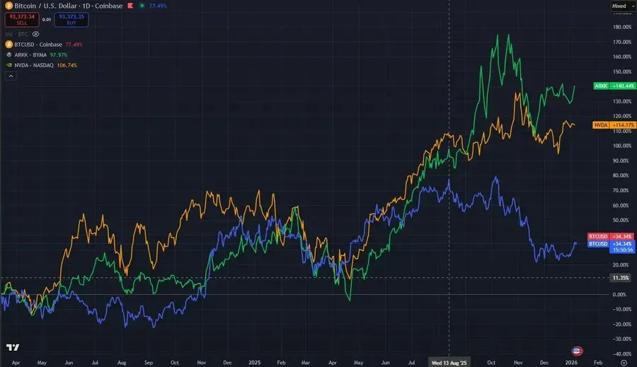 跨资产层面,即便在政策友好和制度红利释放的背景下,BTC 在 2025 年明显跑输黄金、美股、港股、A 股等主要 TradFi 资产,是少数未能跟随全球风险资产创出同步新高的资产之一.