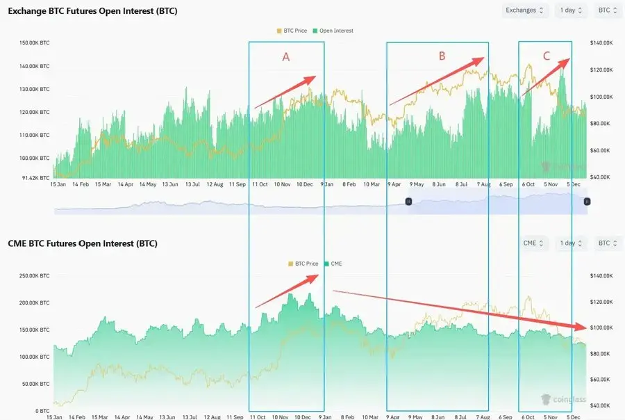 现货:Onshore 是主要买方,Offshore 更偏逢高减仓 Coinbase Premium 在 A/B/C 三个冲顶阶段均维持正溢价,说明高位买盘主要来自以 Coinbase 为代表的 onshore 现货资金。