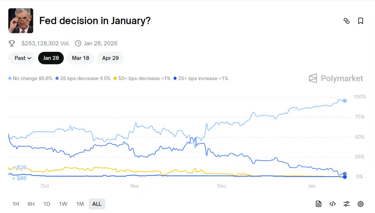 Polymarket 上的最新數據顯示,市場押注聯準會 1 月按兵不動的機率已升至 96%。