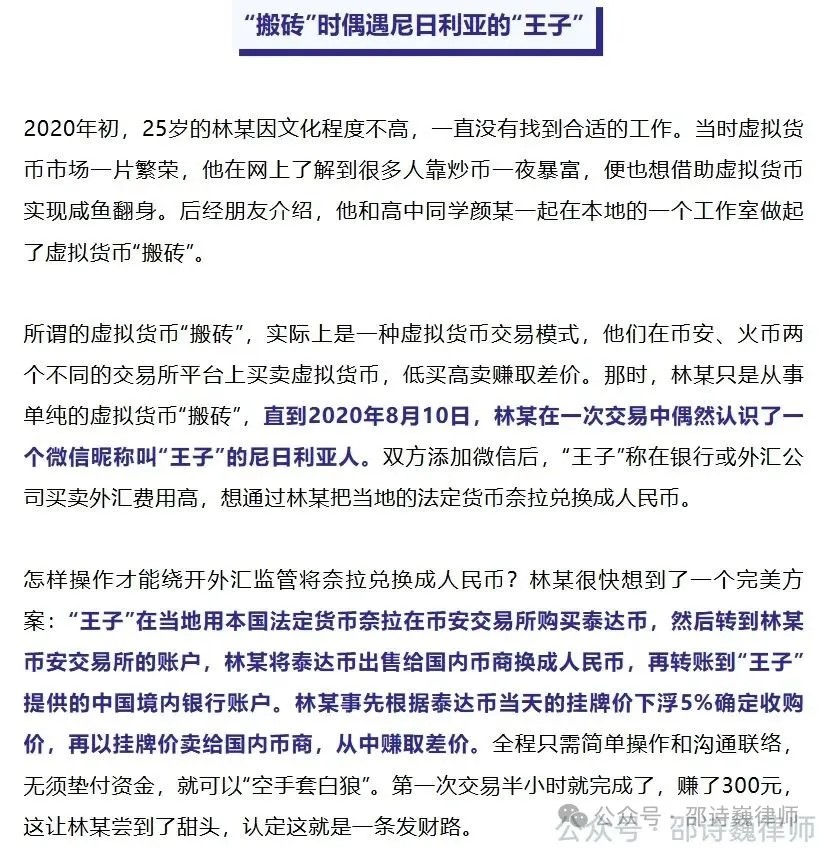 从案情看,林某所谓的“搬砖套利”,实质上是受尼日利亚人“王子”指示操作:王子将奈拉转入林某的币安账户,林某再将收到的 USDT 出售给国内 U 商兑换成人民币,并将资金回转给王子。林某以当日 USDT 挂牌价下浮 5%确定收购价,再按挂牌价出售给 U 商,从中赚取差价。
