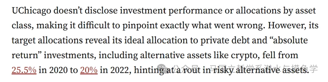 只不过,我们不知道究竟这些亏损和盈利中,有哪些来源于炒币。斯坦福大学校报,则给出了一个不太靠谱的线索:“[芝加哥大学的] 目标资产配置显示,大学对私募债务和‘绝对回报’类投资(其中包括加密货币等另类资产)的理想配置比例,已从 2020 年的 25.5% 下降到2022 年的 20%,这暗示了高风险另类资产出现了一轮明显的撤离(或下挫)。”