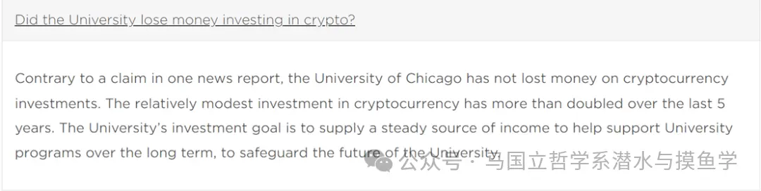 无独有偶,芝加哥大学2025年12月更新的答疑中[1],提到了炒币的事情。根据官方网站的说法:“与某一新闻报道中的说法相反,芝加哥大学并未在加密货币投资上遭受亏损。我校对加密货币的投资规模相对不大,但在过去五年中已增长至原来的两倍以上。我校的投资目标是提供稳定的收入来源,以长期支持我校各项项目,并保障我校的未来。”