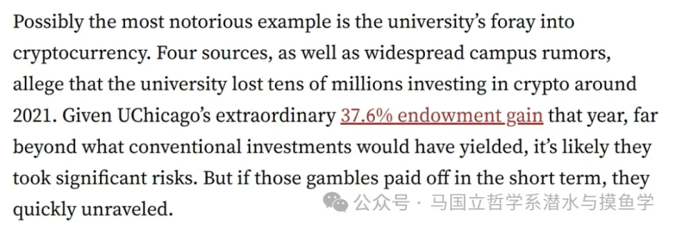 難說。可是從直覺上判斷,芝加哥大學最近五年捐贈基金的總額大約在 100 億美元上下(2021 財年史高,約為 116 億美元;2025 財年約為 109 億 [2]),除非芝加哥大學真的瘋狂到拿自己捐贈基金的至少 60% 去炒幣(這顯然違反各種規定),或者挪用大筆運營經費炒幣,並且全虧掉了,否則應當不會虧六十億這麼多。
