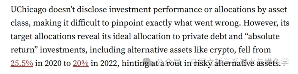 只不過,我們不知道究竟這些虧損和盈利中,有哪些來源於炒幣。斯坦福大學校報,則給出了一個不太靠譜的線索:」[芝加哥大學的] 目標資產配置顯示,大學對私募債務和『絕對回報』類投資(其中包括加密貨幣等另類資產)的理想配置比例,已從 2020 年的 25.5% 下降到 2022 年的 20%,這暗示了高風險另類資產出現了一輪明顯的撤離(或下挫)。「