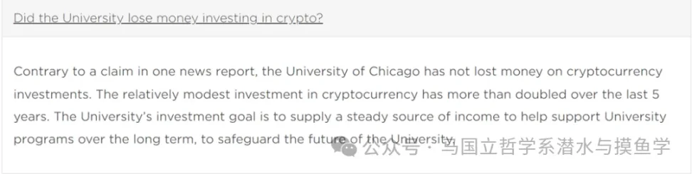 無獨有偶,芝加哥大學 2025 年 12 月更新的答疑中 [1],提到了炒幣的事情。根據官方網站的說法:「與某一新聞報導中的說法相反,芝加哥大學並未在加密貨幣投資上遭受虧損。我校對加密貨幣的投資規模相對不大,但在過去五年中已增長至原來的兩倍以上。我校的投資目標是提供穩定的收入來源,以長期支援我校各項專案,並保障我校的未來。」