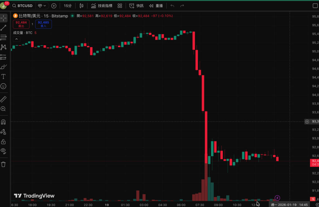 在 華爾街多數交易員休假、流動性稀薄的週末夜,比特幣 (Bitcoin) 再度上演高速滑落。美東時間 18 日晚間,受川普總統關於「若丹麥不售格陵蘭將對八個北約盟國課徵 10% 關稅」的訊息影響,該加密資產四小時內自 95,500 美元急墜至 92,474 美元,並引爆超過 7.5 億美元多頭合約清算。市場在地緣政治與監管雙重陰影下,重新衡量風險資產部位。