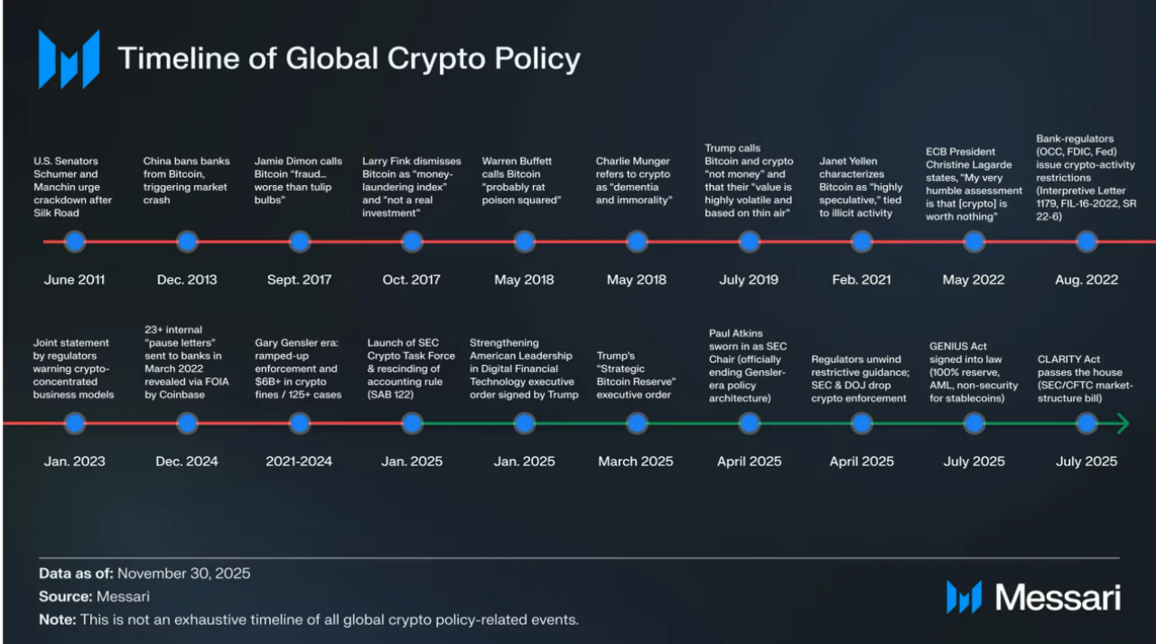 在过往周期中,监管更多以负面方式介入市场:要么在行情高点通过禁令、调查或执法打断风险偏好,要么在熊市中以追责形式集中释放不确定性。这种模式下,政策往往既无法有效保护投资者,也难以为行业提供长期发展预期,反而加剧了周期的剧烈波动。而进入 2025 年,这一治理方式开始发生结构性变化:行政令先行、监管机构口径趋同、立法框架逐步推进,逐步取代此前以个案执法为主的监管模式。