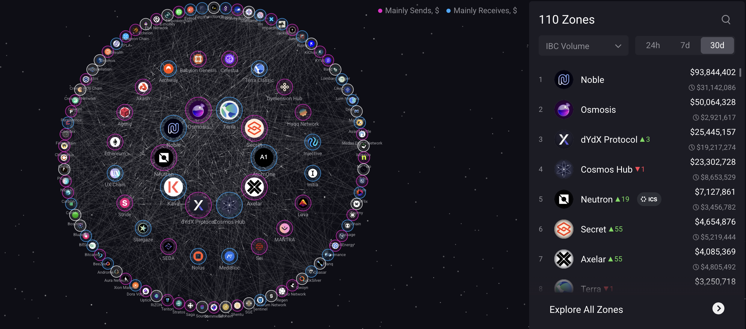 Map of Zones数据显示,过去30天,Noble IBC交易量达9384万美元,在IBC连接的110个Zones中稳居第一,规模是第二名Osmosis的1.8倍以上。而其余大量链要么几乎处于停滞状态,要么月交易量低迷。某种程度上说,当前IBC生态的活跃度,很大一部分正由Noble所支撑。