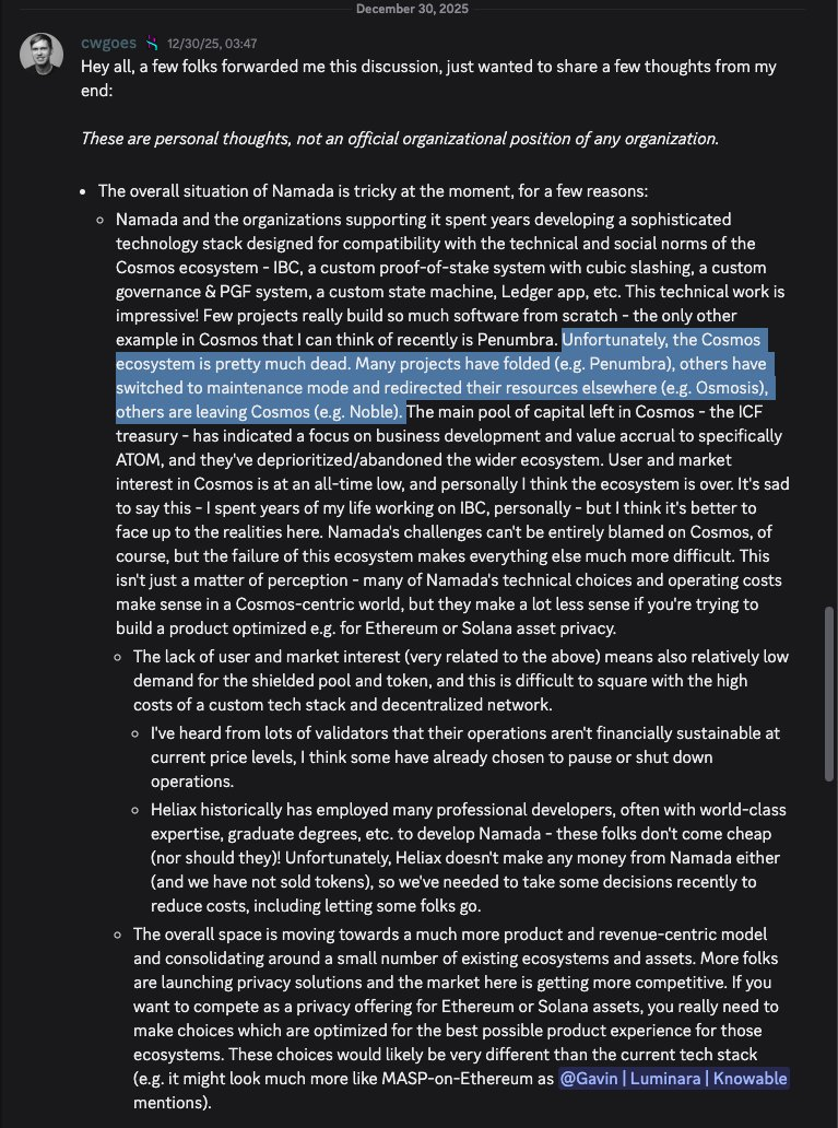 去年,Cosmos Labs(前Interchain Labs)还面临中心化争议。Cosmos网络验证者POSTHUMAN当时公开指出,Cosmos Labs并不代表Cosmos社区整体,其投票权低于Cosmostation,且与ICF关系密切,其倡导强者生存的路线、叫停EVM实施、冻结ISC相关付款并推动私有链路径,导致项目出走、损害了Cosmos声誉与ATOM持有者利益,呼吁应由社区与建设者主导发展。