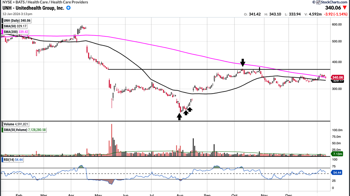 UNH是交易“瀑布式下跌”的一个案例。这是一种风险较高的设置,但可以通过结合“延迟买入”(等待卖方减少)和在“V型反转”右侧加仓的原则来管理风险。