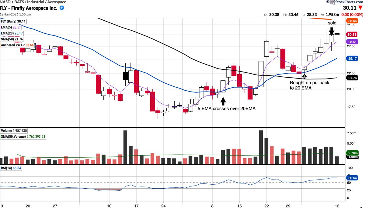 以近期的FLY交易为例。该股票曾一度引起投资者的关注,但在等待5日EMA上穿并站稳20日EMA后,才在股价回测20日EMA时入场。这笔交易最终被证明是成功的,在约六个交易日内带来了35%至36%的收益。