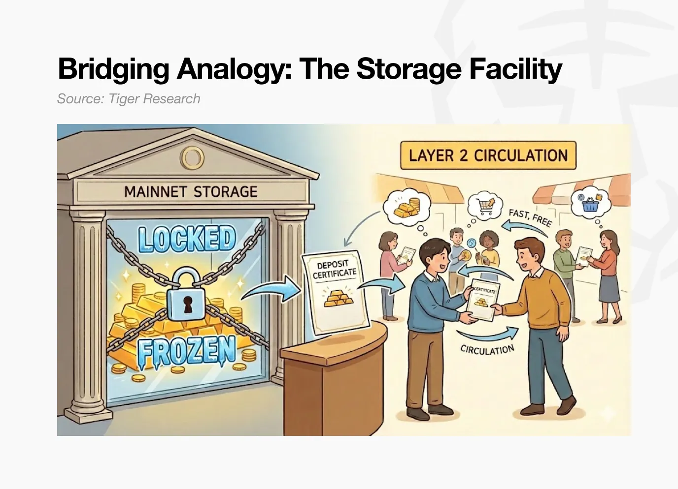 大多数人认为他们的资产只是被转移了。实际上,这个过程更接近于冻结。当你将资产存入桥接合约时,合约将它们托管起来。Layer 2铸造等量的代币。你可以在Layer 2上自由交易,但你在主网上的原始资产仍然被锁定且处于闲置状态。
