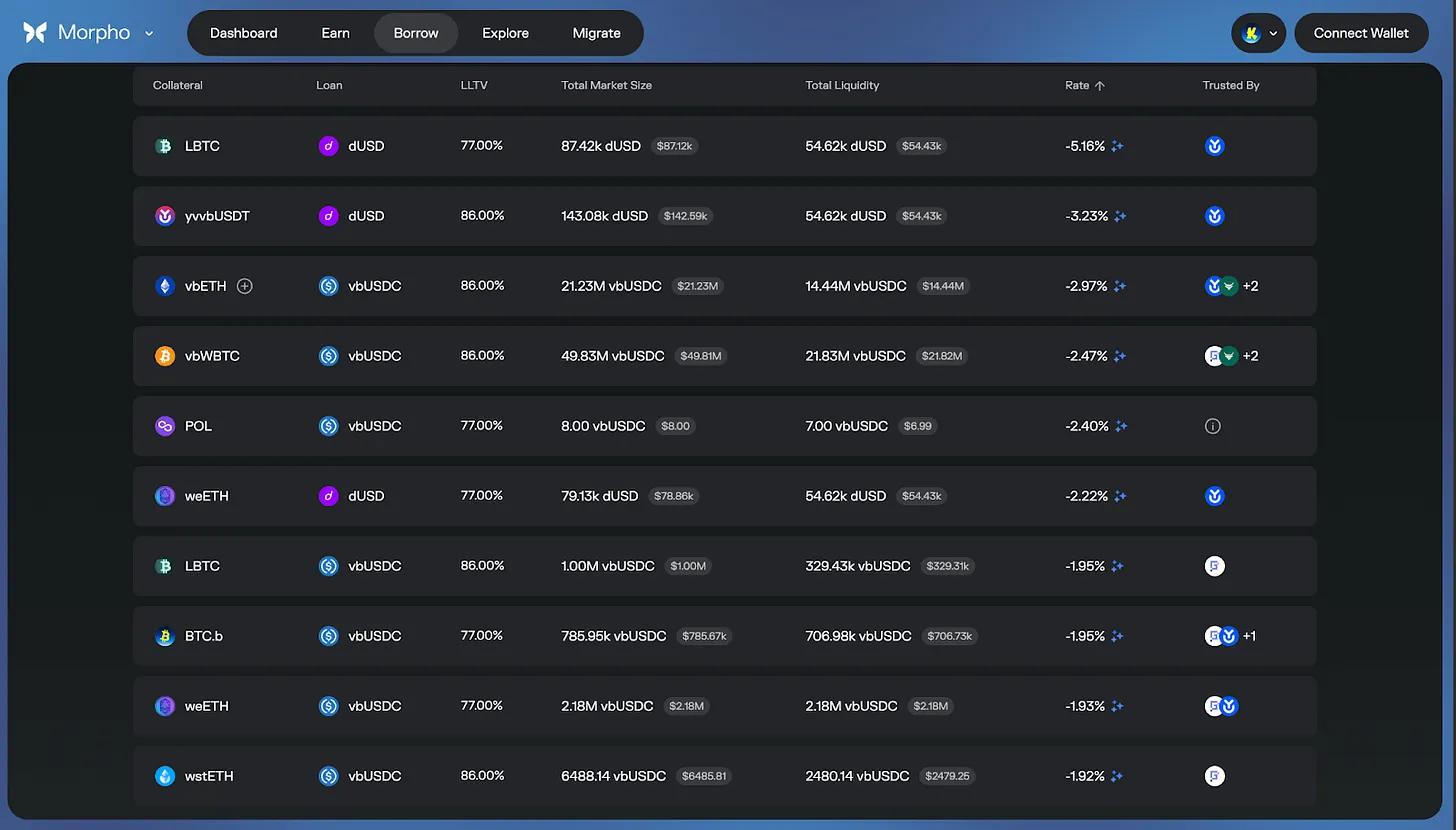 Katana的激励结构还能在特定时点显著降低实际借贷成本,甚至根据市场状况和奖励方案创造负利率。这是因为Vault Bridge、CoL和AUSD的收益都被重新投资到核心市场。不过需要注意的是,这些都是随市场条件变化的激励驱动型结果。