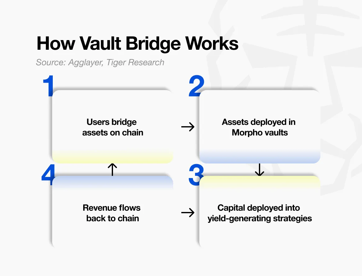 第一种机制是 Vault Bridge 。当用户将资产发送到Katana时,留在以太坊主网上的原始资产会被部署到借贷市场产生利息。