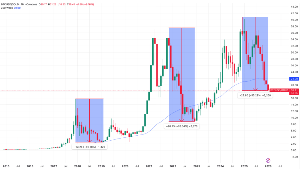 ,BTC/XAU 比率已跌破維持逾 12 年的長期支撐趨勢線,這意味著以黃金計價的比特幣正式進入「深度熊市」。歷史經驗表明,一旦這種技術面關鍵位置失守,後續跌勢往往會進一步加深。