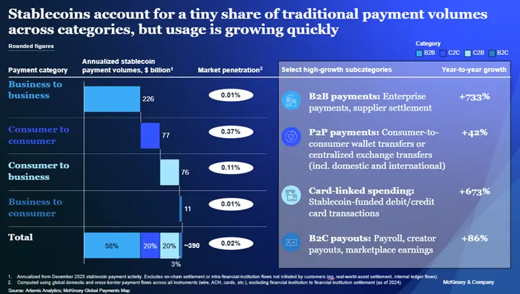 2. B2B 引领增长。B2B 支付占据主导地位,金额约为 2260 亿美元,约占全球稳定币支付总额的 60%。B2B 支付同比增长 733%,预示着 2026 年将迎来快速增长。