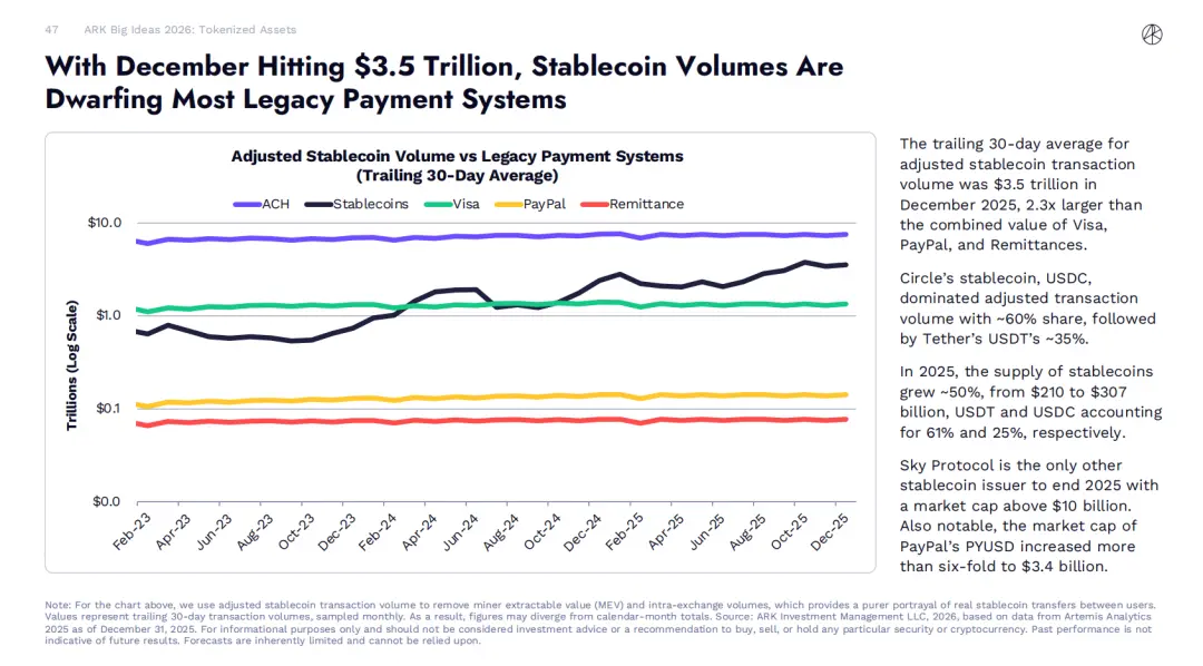 ARK Invest 2026 Big Ideas 数据显示:2025 年 12 月,调整后的稳定币交易量的 30 天移动平均值为 3.5 万亿美元,是 Visa、PayPal 和汇款业务总和的 2.3 倍。