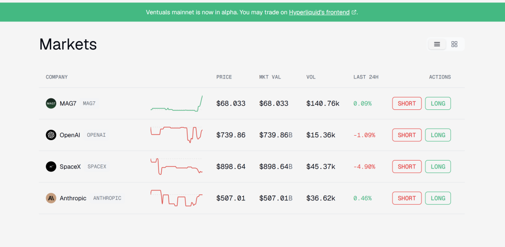 - 合成资产型(Republic、Ventuals):包括Perps类和债务票据类,不持有底层股权,仅提供估值敞口,以高杠杆满足投机需求,主要起流量引入作用。