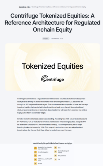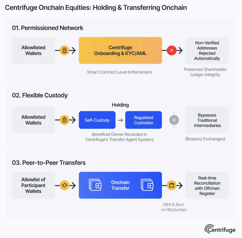2025年12月5日,Centrifuge发布《Centrifuge Tokenized Equities: A Reference Architecture for Regulated Onchain Equity》,系统化给出合规链上股权的参考实现框架,其核心思路与市场已验证的逻辑一致:由受监管的过户代理(Transfer Agent)统一管理股东名册,实现受限转让流程的透明化,确保链上代币与实体股权法律效力一致。