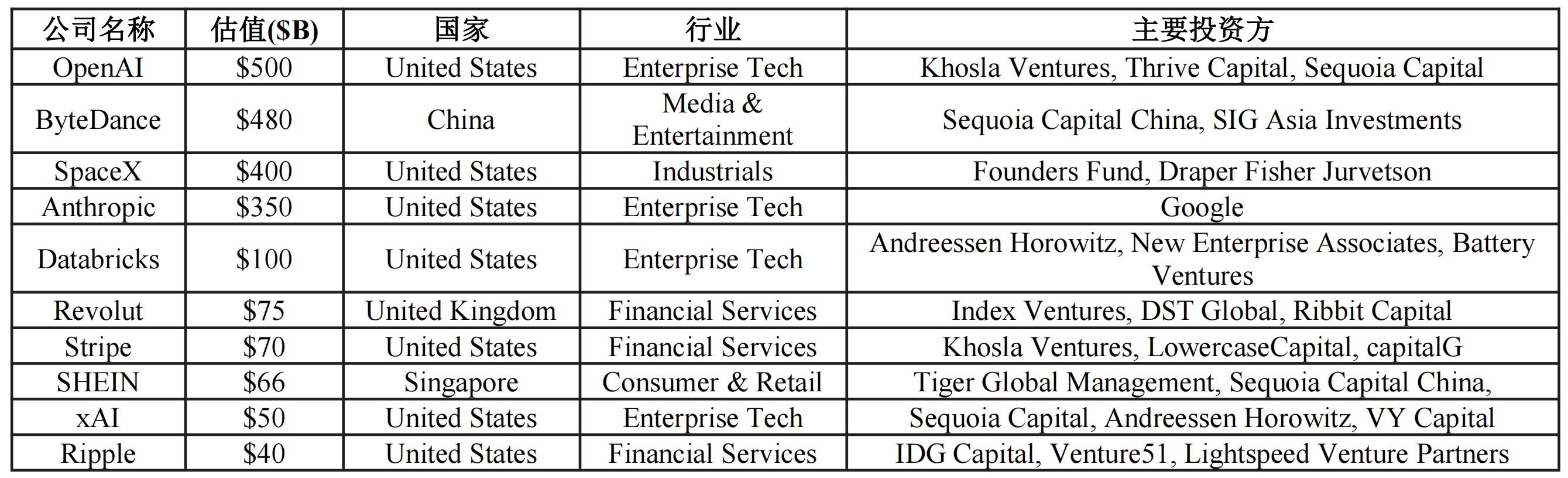 表2: 全球私人市场与独角兽估值的关键指标统计表