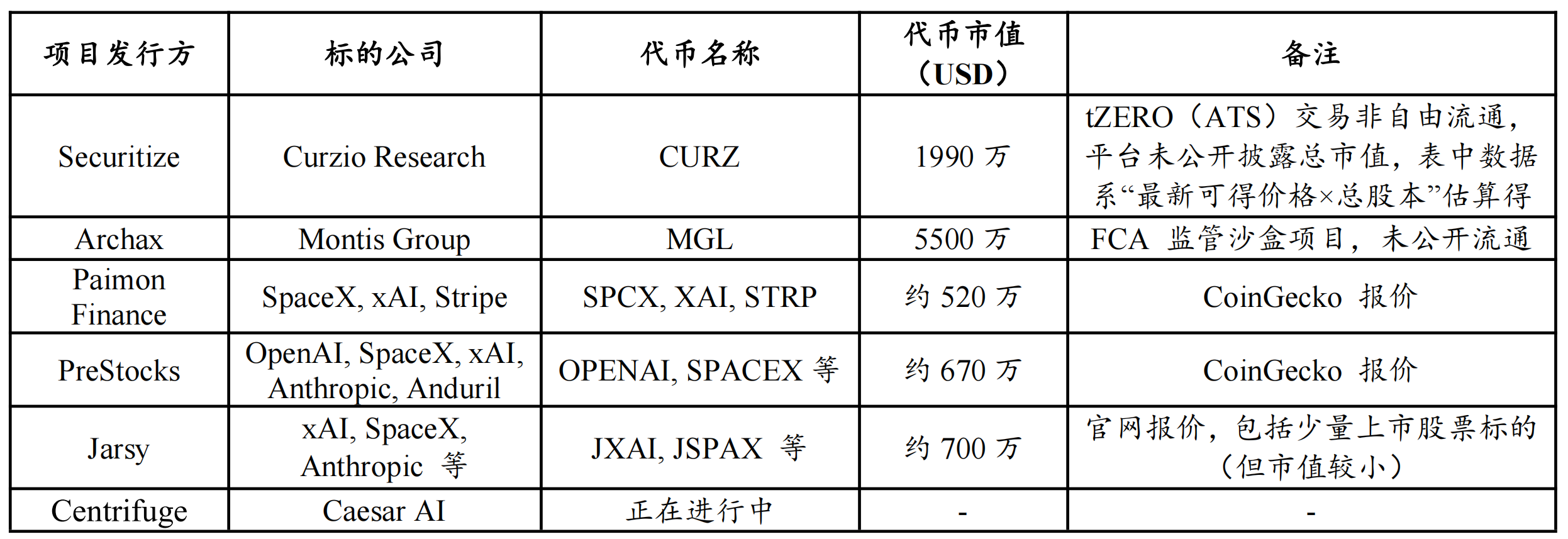 从底层标的分布看,除个别特殊项目外,当前代币化标的呈现明显的高度同质化与头部集中特征,主要聚焦美国顶尖科技独角兽,且以 AI 相关资产为核心(如 OpenAI、SpaceX、xAI 等)。