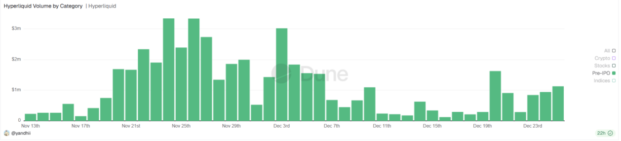 图6: Hyperliquid平台 Pre-IPO 相关资产日交易量图(USD)