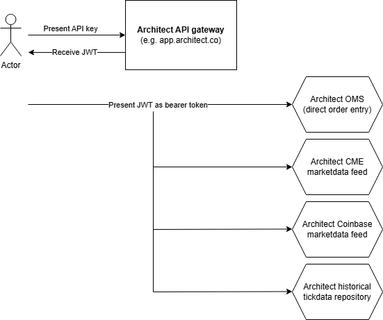 Architect 使用 OAuth 身份认证体系 来验证平台用户身份。用户可以创建 机密 API Key ,用于以程序化方式访问 Architect 的各类服务。这些 API Key 需要先被 兑换为短期有效的 JWT(JSON Web Token) ,随后才能用于 直连 Architect 系统 ,完成下单(Order Entry)和行情数据(Market Data)的访问。