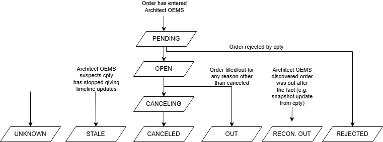 在 Architect 中, 订单管理的核心在于对订单整个生命周期状态的统一追踪 。Architect 对不同交易所和执行场所的订单状态进行了 标准化抽象 ,为用户提供一致的订单生命周期视图。状态转换遵循预期路径,处于生命周期底部的状态被视为 终态 ,不会再发生变化。