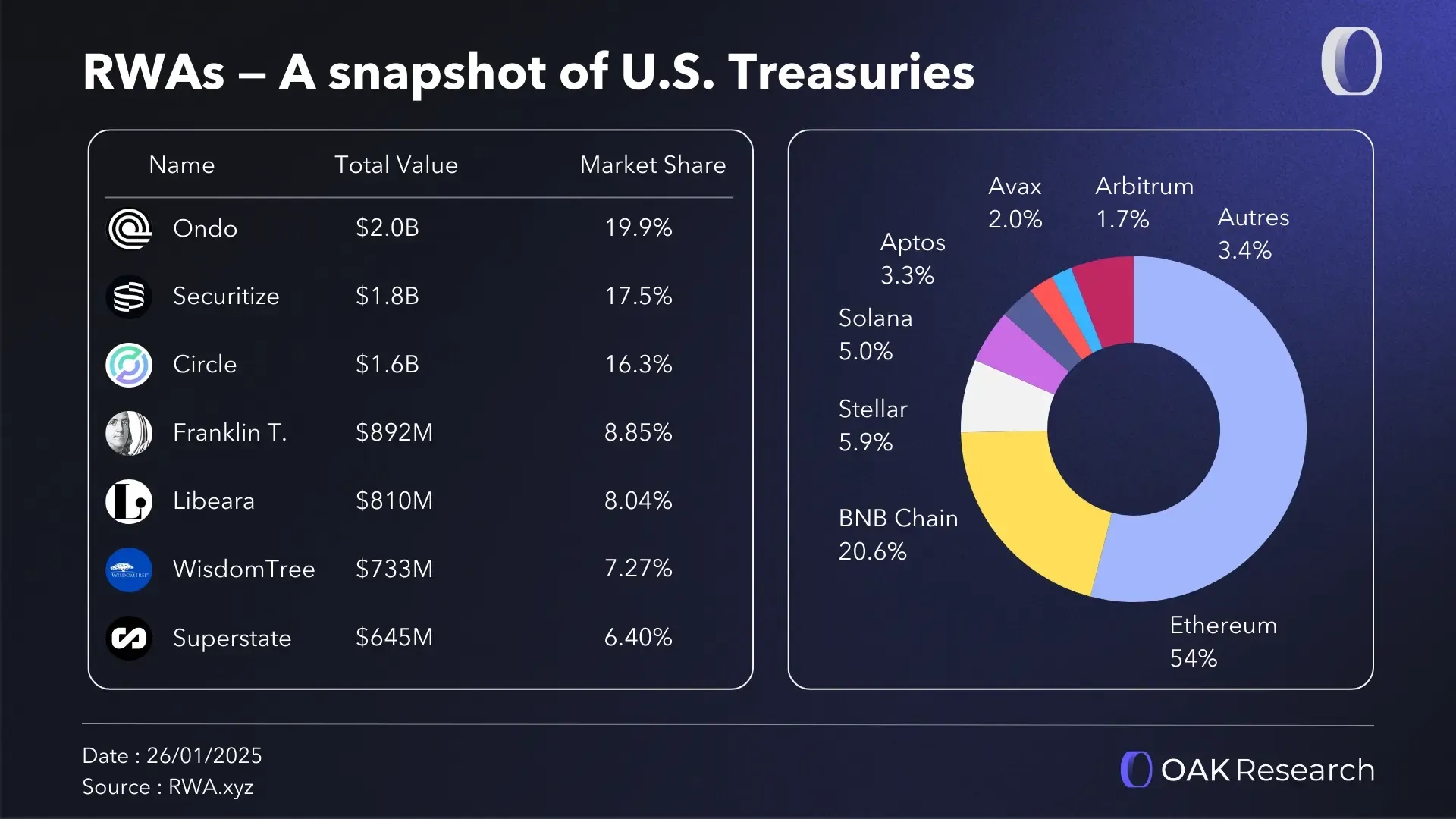 美国国债是目前最成熟、最主导性的 RWA 细分市场。通过将全球最安全、流动性最强的资产代币化,发行人向投资者提供了连续访问、近乎即时结算和碎片化持有的能力。