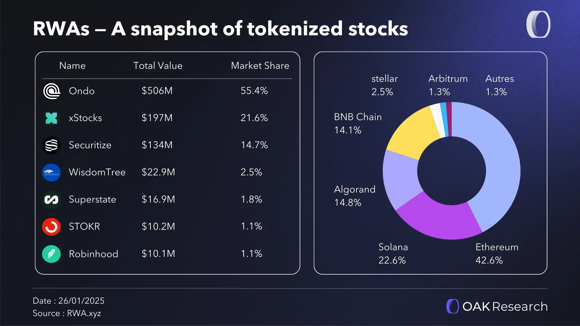 代币化股票是对上市公司或私营公司股份的数字化表示,使其能够在传统市场交易时间之外进行连续交易,并实现更快的结算。对于公开市场股票而言,这类代币通常由托管账户中持有的真实股票作为背书;而对于私募股权,代币化则简化了股权结构的管理,并使合规的二级市场成为可能。
