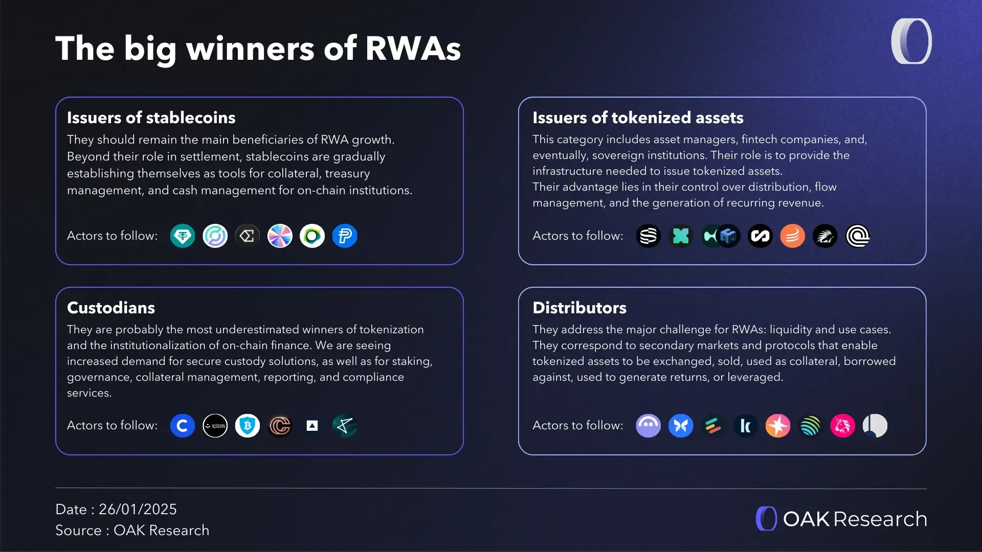 托管机构很可能是机构级代币化进程中最关键、同时也最被低估的赢家。随着机构越来越多地与链上资产互动,对安全、合规、并具备保险保障的托管解决方案的需求将不可避免。