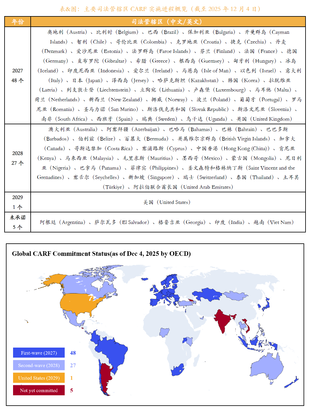 根据 OECD 全球论坛发布的信息,截至 2025 年底,已有 76 个国家和地区承诺实施 CARF ,并将分批推进制度落地。