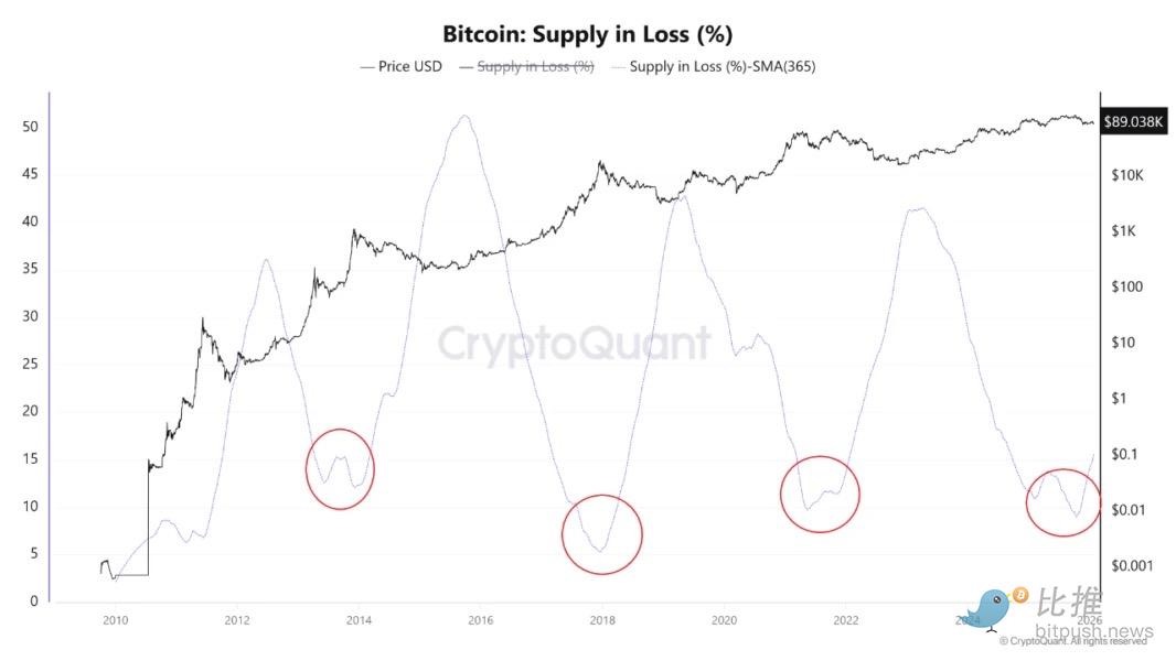 CryptoQuant 的最新分析显示, 比特币「处于亏损状态的供应占比」 (Supply in Loss)的 365 日均线正在重新上行。这一指标用于衡量当前价格低于其最近一次链上转移价格的比特币占比,是观察市场结构变化的重要工具。