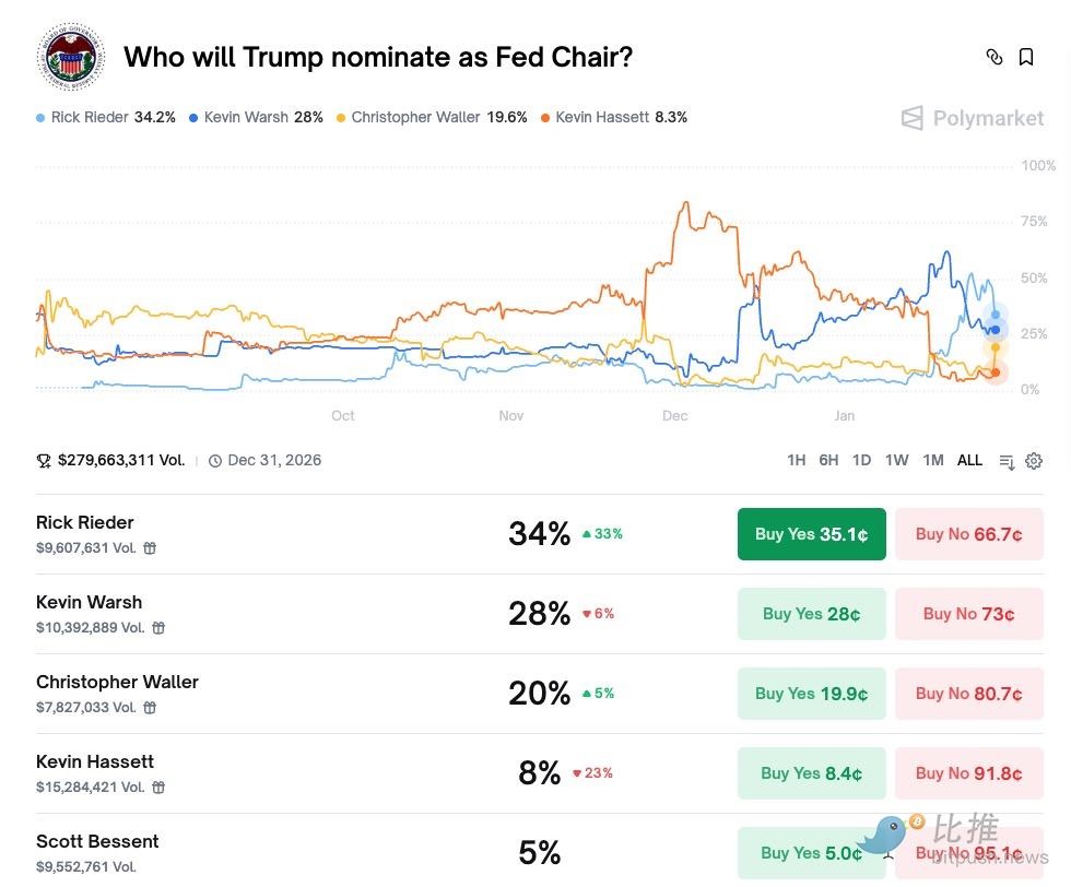 在市场看来,如果 Rieder 出任美联储主席,意味着央行决策将更重视金融条件与资产价格信号,在通胀允许范围内保持政策弹性。这一预期解释了为何他在预测市场中获得越来越多资金支持——这是一种对「可预测性」和「市场友好度」的押注。