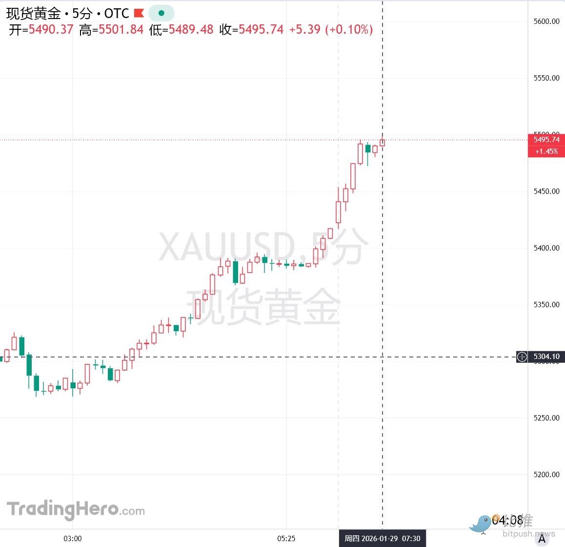 利率决议公布后 , 现货黄金价格一路飙升,首次突破 5500 美元/盎司大关 。短短四个交易日内,金价从略低于 5000 美元一路上行,连破多道整百关口,累计上涨超过 500 美元,周涨幅达到 10%。这一速度和幅度,使黄金成为当下全球市场毫无争议的主角。