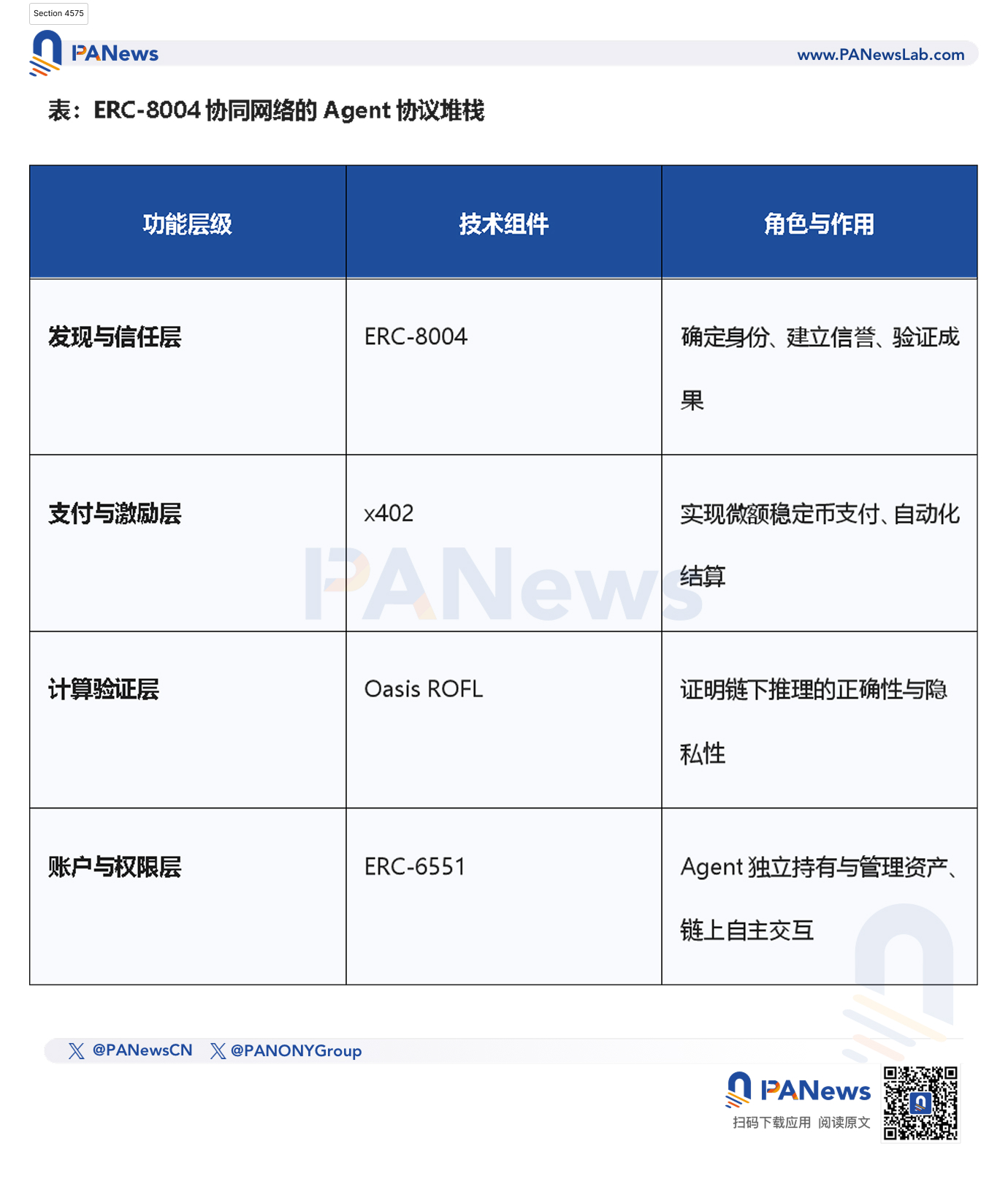 当一个ERC-8004的Agent ID与其自身的ERC-6551账户绑定时,这个Agent便拥有了持有和管理资产、签署合约与自主进行链上交互的能力。