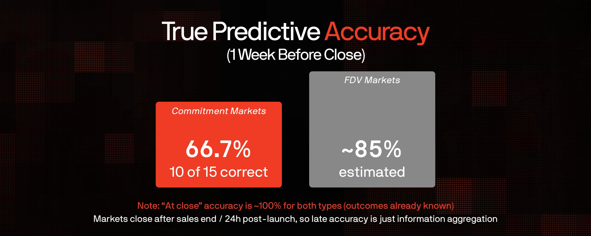 关键洞察: 认购市场和FDV市场之所以在收盘时趋向于100%的准确率,是因为它们是在结果已基本确定后才进行结算的。认购市场在销售结束后关闭;FDV市场在发布24小时后关闭。唯一有意义的预测指标是收盘前1周的准确率,那才是真正存在不确定性的时候。66.7%的认购预测准确率表明,在关键时刻,市场有1/3的时间是错误的。