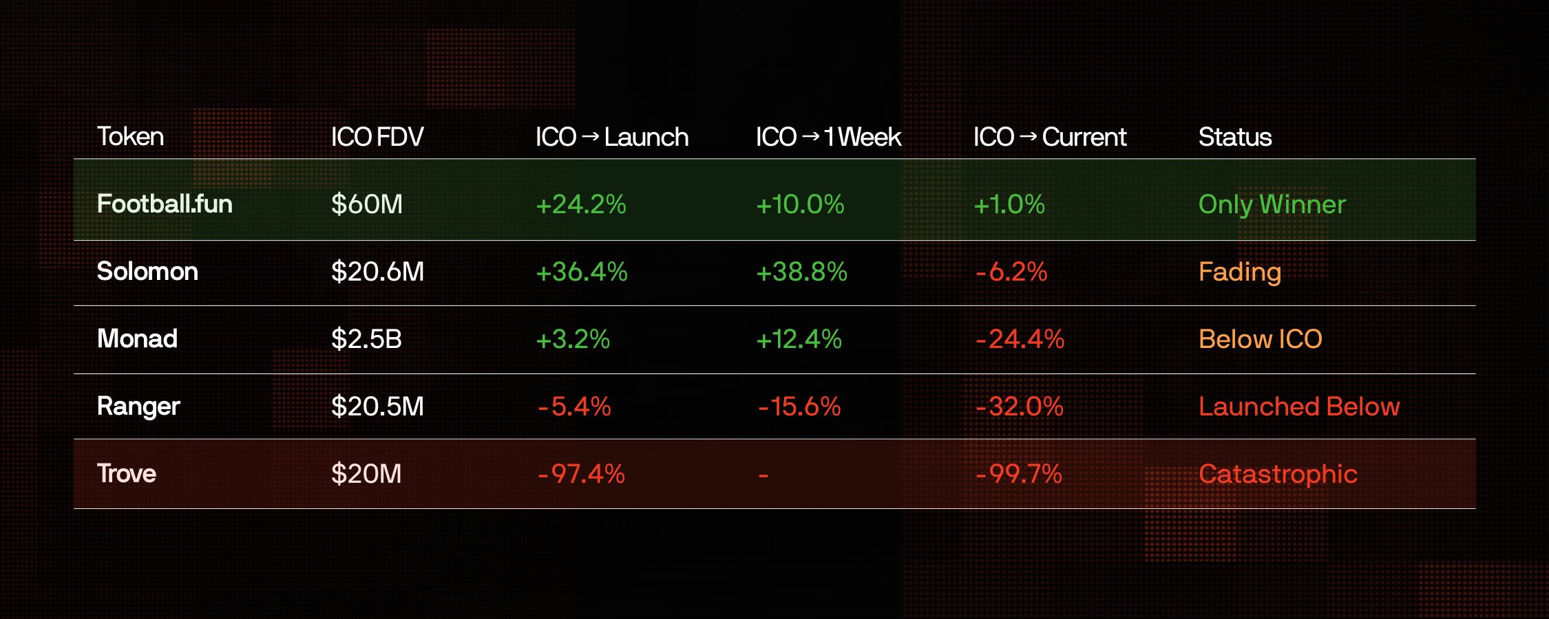这种模式是残酷的:即使是上线价格高于ICO估值的代币(如Monad、Solomon),最终也跌破了发行价。Football.fun是该数据集中5个ICO代币中唯一的赢家,目前仅比ICO价格高出1%。